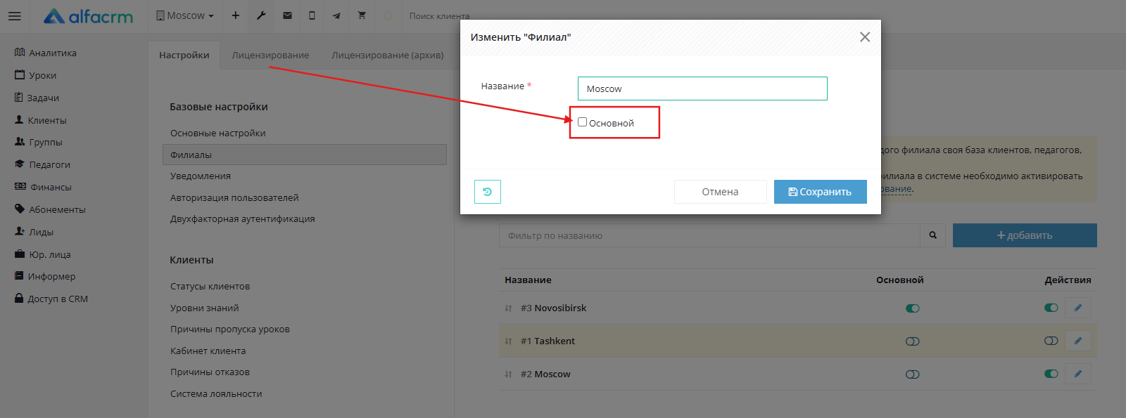 Установите флажок «Основной филиал». Сохраните изменения.