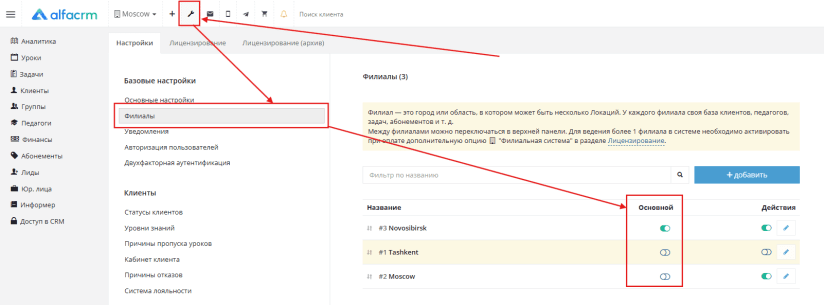Перейдите в «Настройки» → «Филиалы» → В поле «Основной» переключите флаг в строке с названием нужного филиала.