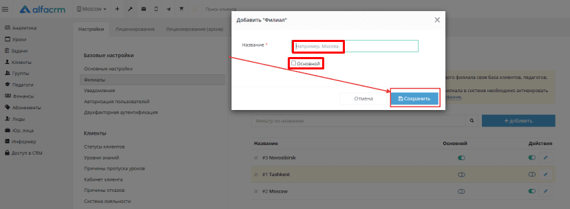 Укажите название. При необходимости отметьте «Основной филиал». Нажмите «Сохранить».
