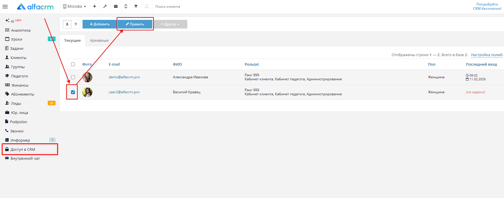 Перейдите в «Доступ в CRM» → «Управление пользователями». Выберите сотрудника → нажмите «Править».