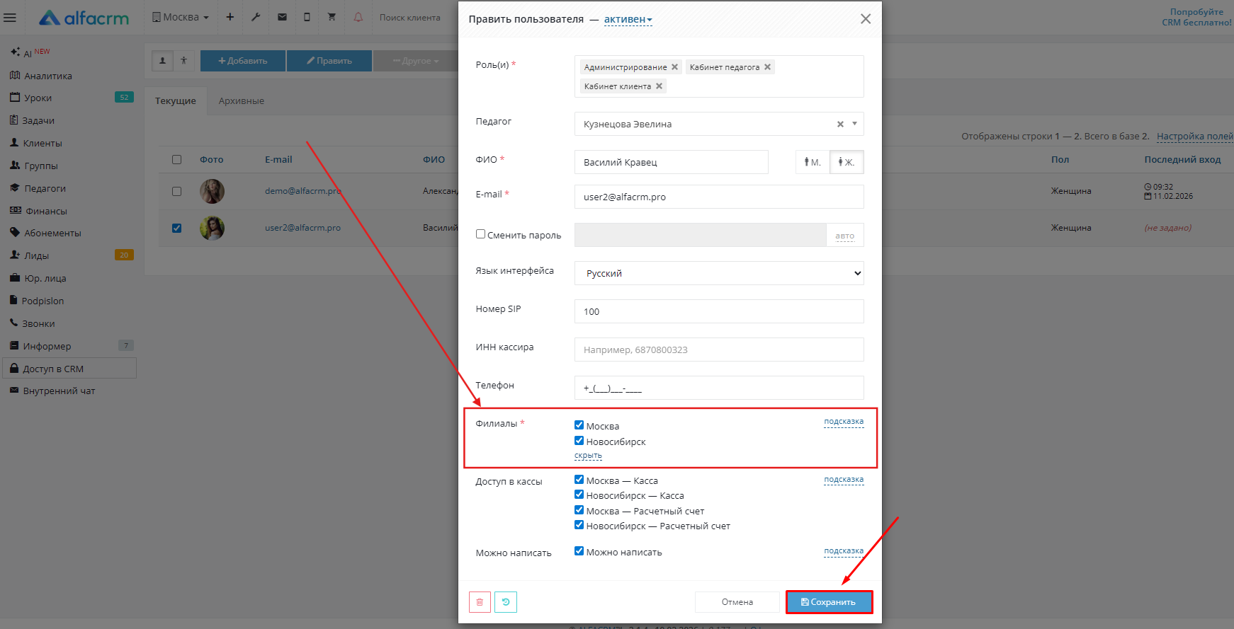В разделе «Филиалы» отметьте нужные филиалы. Сохраните изменения.
