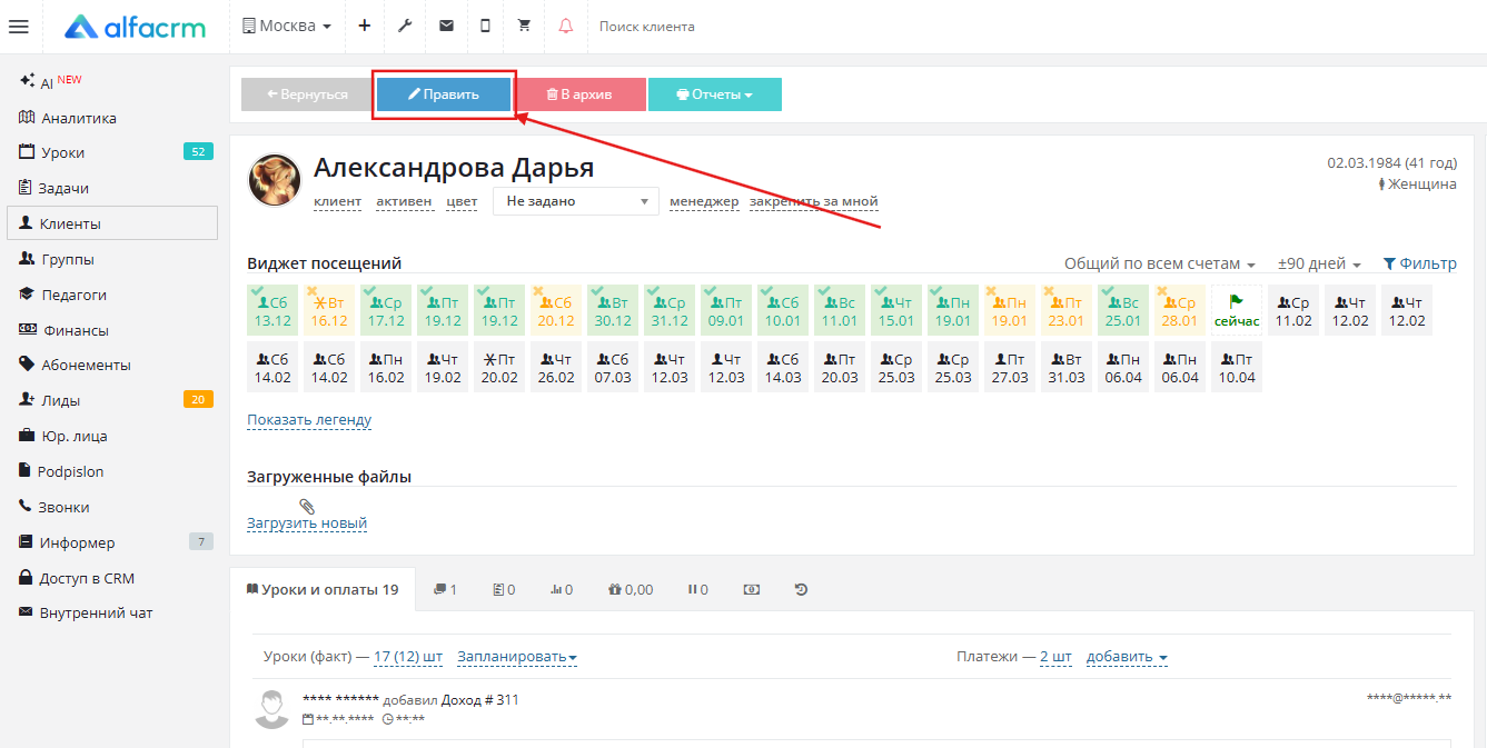 Откройте карточку клиента. Нажмите кнопку «Править».