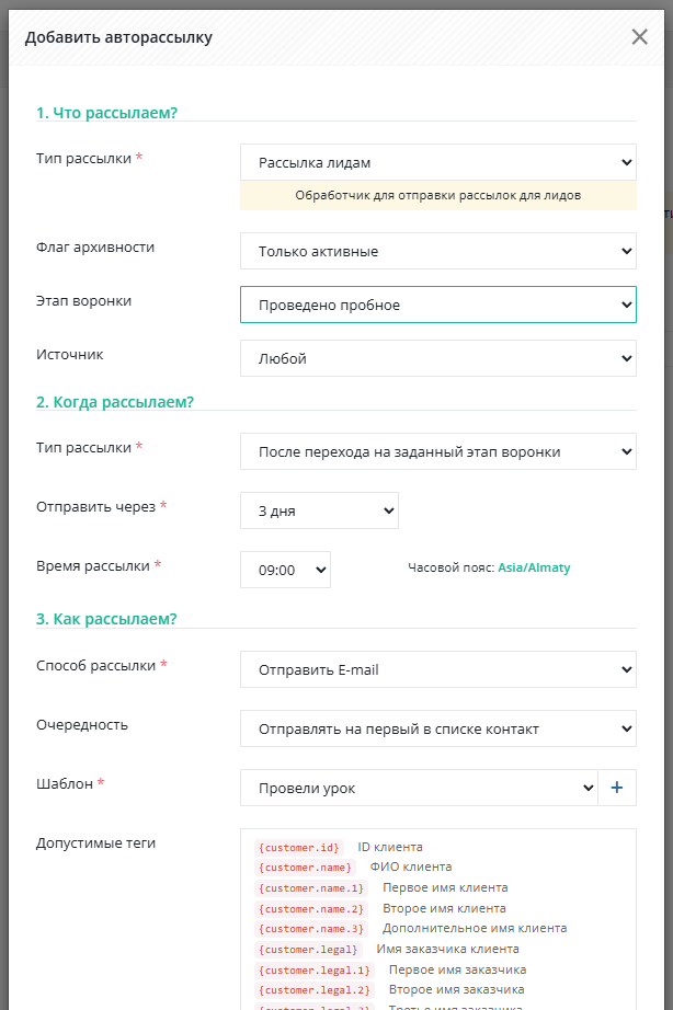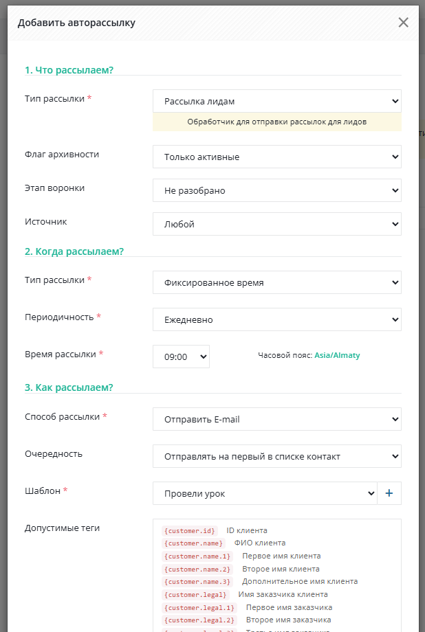 Тип авторассылки "Рассылка лидам" позволяет автоматически отправлять письма или SMS потенциальным клиентам (лидам), которые еще не стали учениками в заданный момент времени. Рассылка выполняется спустя указанное количество дней после перехода лида на определенный этап воронки продаж или фиксировано с периодичностью ежедневно, еженедельно, ежемесячно для всех лидов или лидов с определенным этапом воронки и/или источником. Инструкция по настройке рассылки: