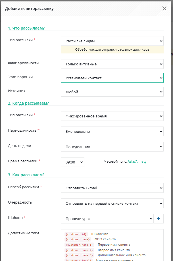 Пример добавления автоматической рассылки представлен на скриншоте: