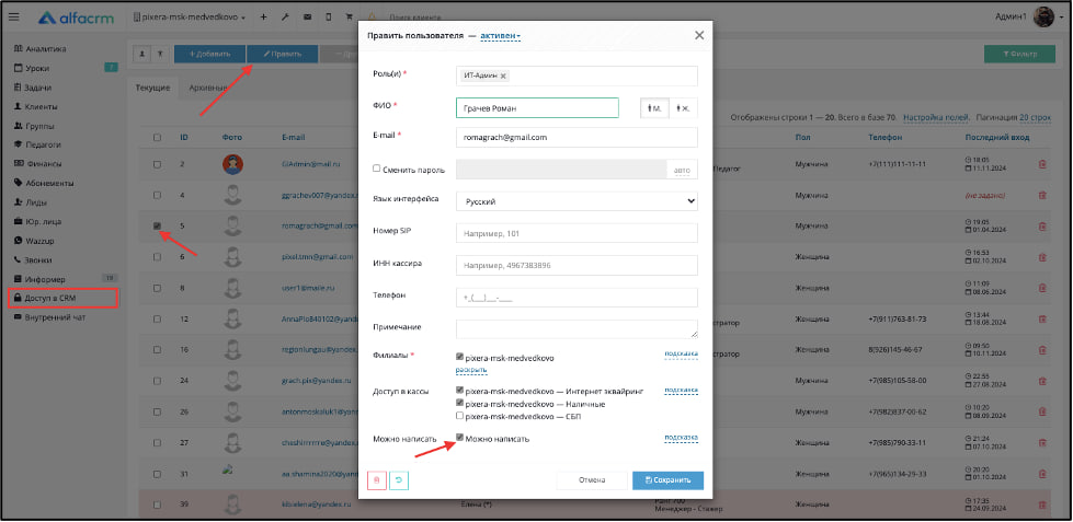 Важно знать: если необходимо отключить возможность писать определенному пользователю в системе, для этого перейдите в раздел «Доступ в CRM» – выберите нужного пользователя – «Править», уберите галку напротив поля «Можно написать», сохраните.